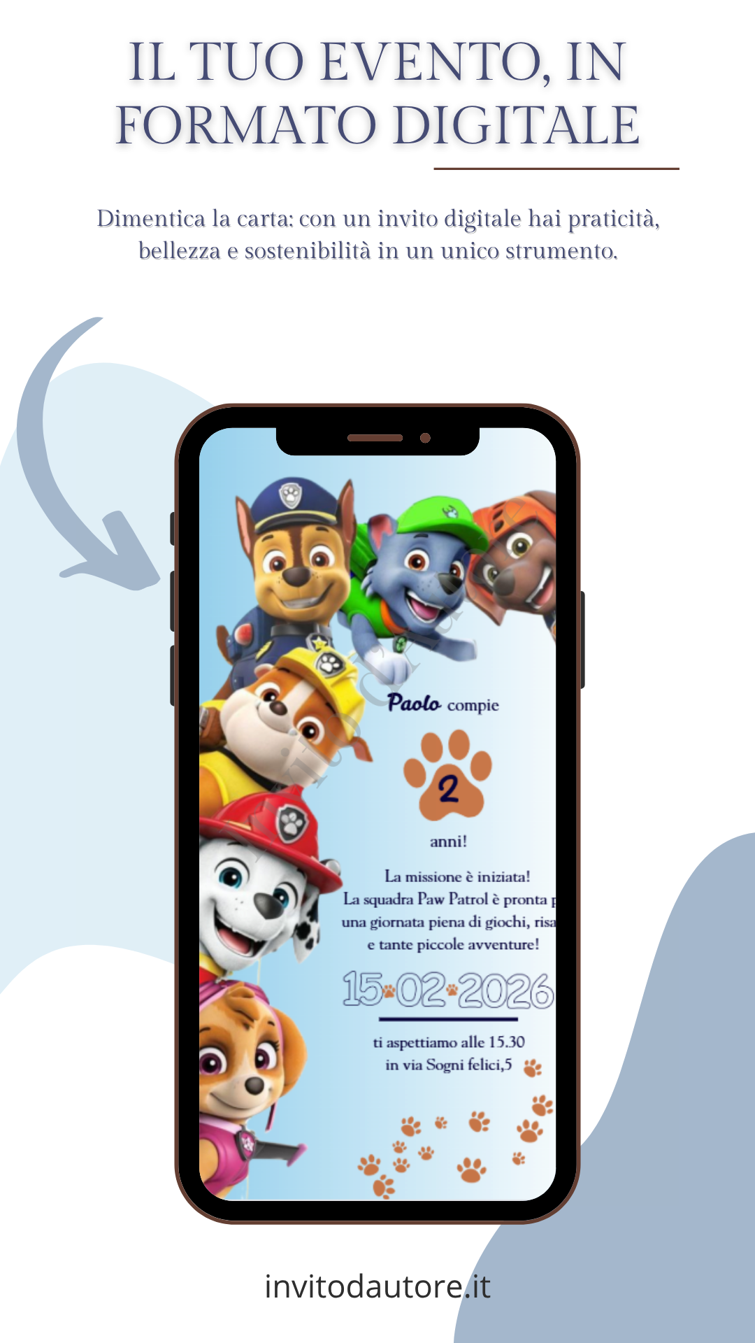 Un invito digitale pieno di grinta e avventura, perfetto per i piccoli fan della Paw Patrol! Colori vivaci, dettagli ispirati ai cuccioli eroici e un design allegro rendono questo invito l’ideale per una festa ricca di missioni divertenti e risate. Personalizzabile in ogni dettaglio, dal luogo alla data trasformerà il compleanno in una vera “missione da cucciolo”!