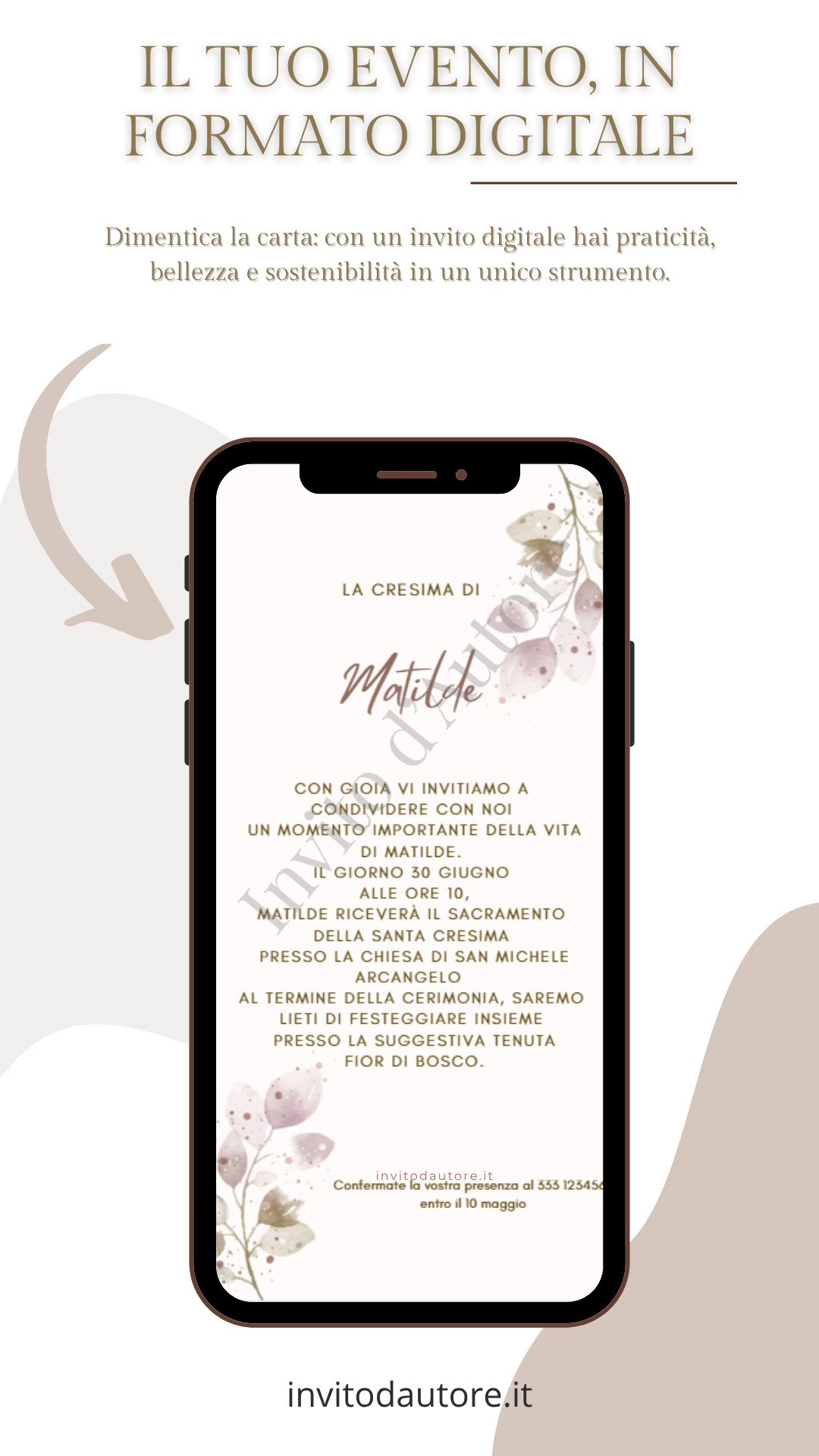 Un invito digitale semplice e raffinato, perfetto per celebrare la cresima. Lo sfondo bianco mette in risalto i delicati dettagli rosa, mentre le linee minimal conferiscono un tocco elegante e moderno. Totalmente personalizzabile, permette di modificare nome, data, luogo e qualsiasi altro dettaglio, rendendo l’invito unico e perfettamente adattato alla famiglia. Ideale per chi cerca un invito chiaro, elegante e pronto da condividere con amici e parenti.
