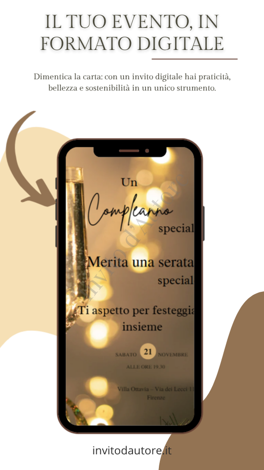 Un invito digitale elegante e raffinato, perfetto per festeggiare un compleanno speciale con stile.Colori dorati, luci soffuse e dettagli scintillanti creano l’atmosfera ideale per una serata indimenticabile.Completamente personalizzabile per adattarsi a ogni occasione di festa.